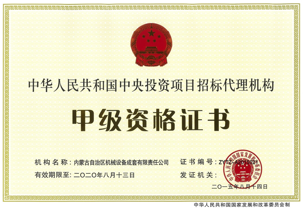 中央投資項目招標代理機構(gòu)甲級資格證書